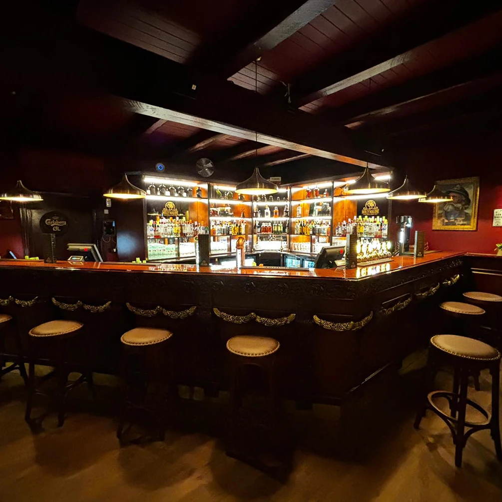 This is a stylish bar/restaurant project featuring a blend of entertainment and dining. It boasts multiple billiard tables for leisure, creating a vibrant social space. The bar area is well-stocked with a vast selection of spirits, beers, and cocktails, complemented by elegant wooden decor and warm lighting.