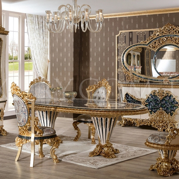 Luxury Dining Set Golden Foil Hand Carved Italian Style Dining Room Furniture Round Dining Table